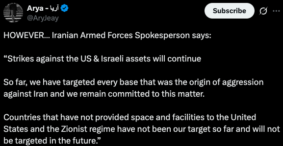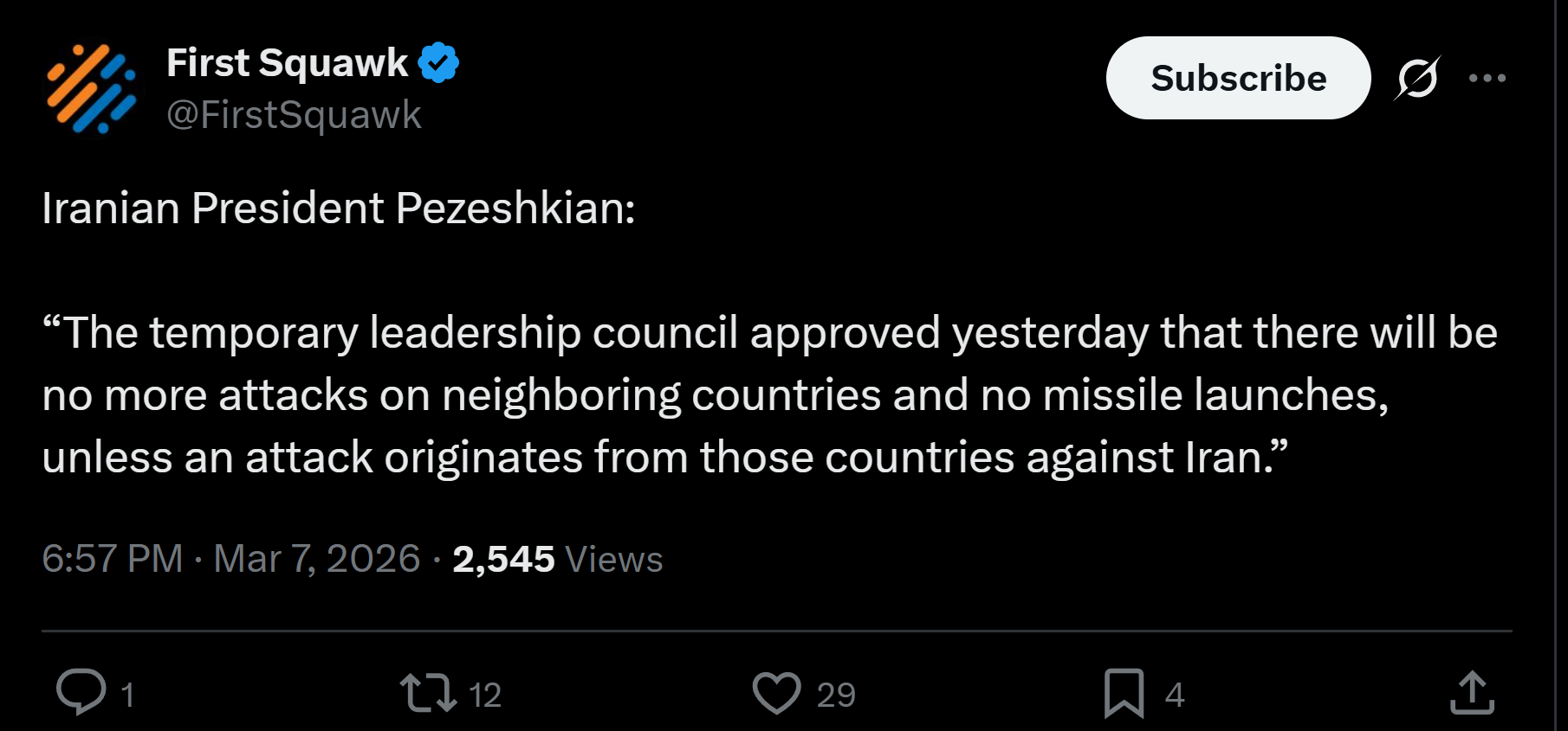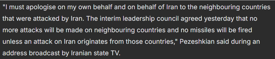 >President Pazeskian has stated: >The interim leadership council of Iran has decided to suspend all kinds of attacks against neighboring countries. However, the decision also says that Iran will retaliate only if attacks originate from the territory of those countries.