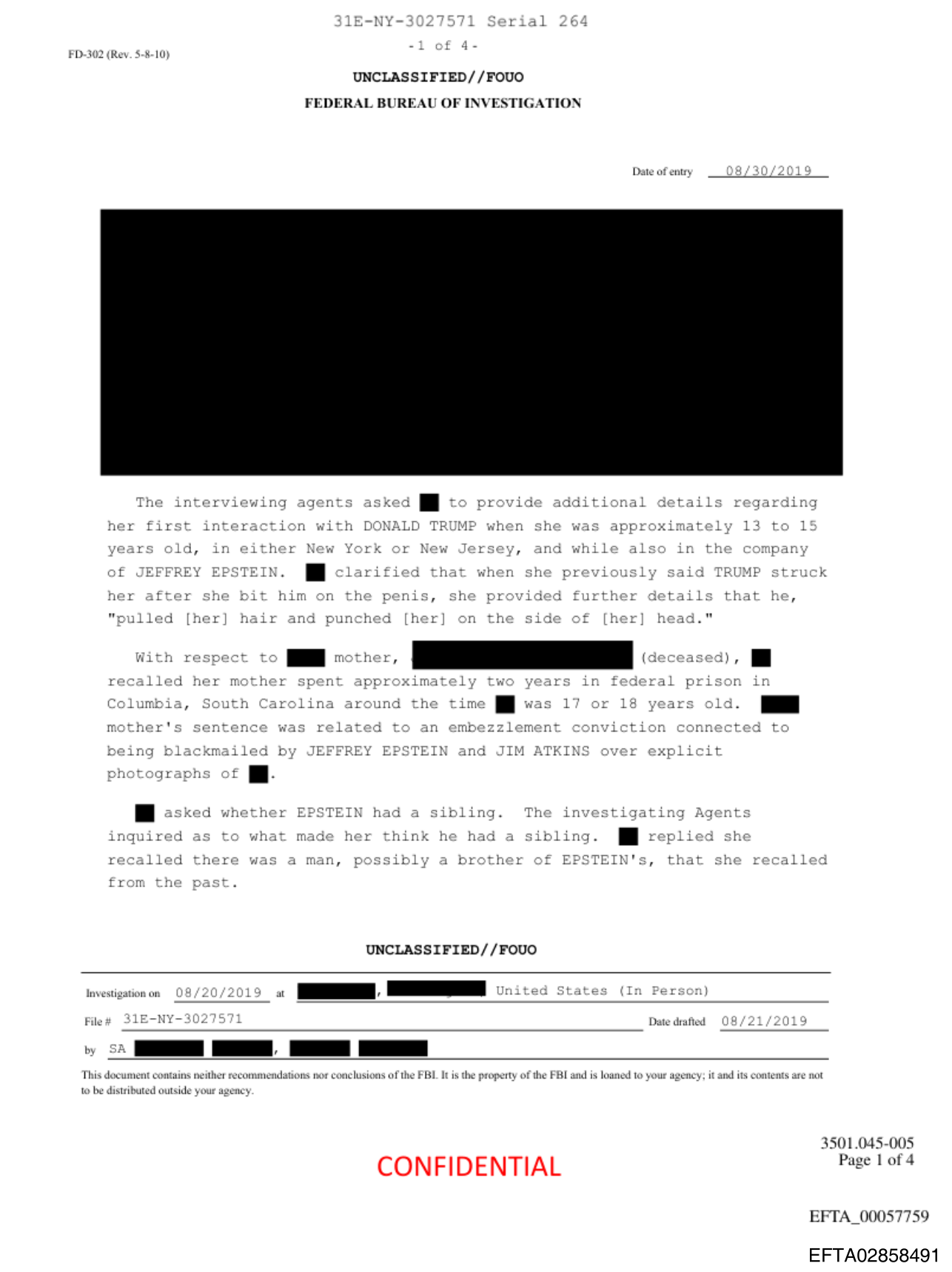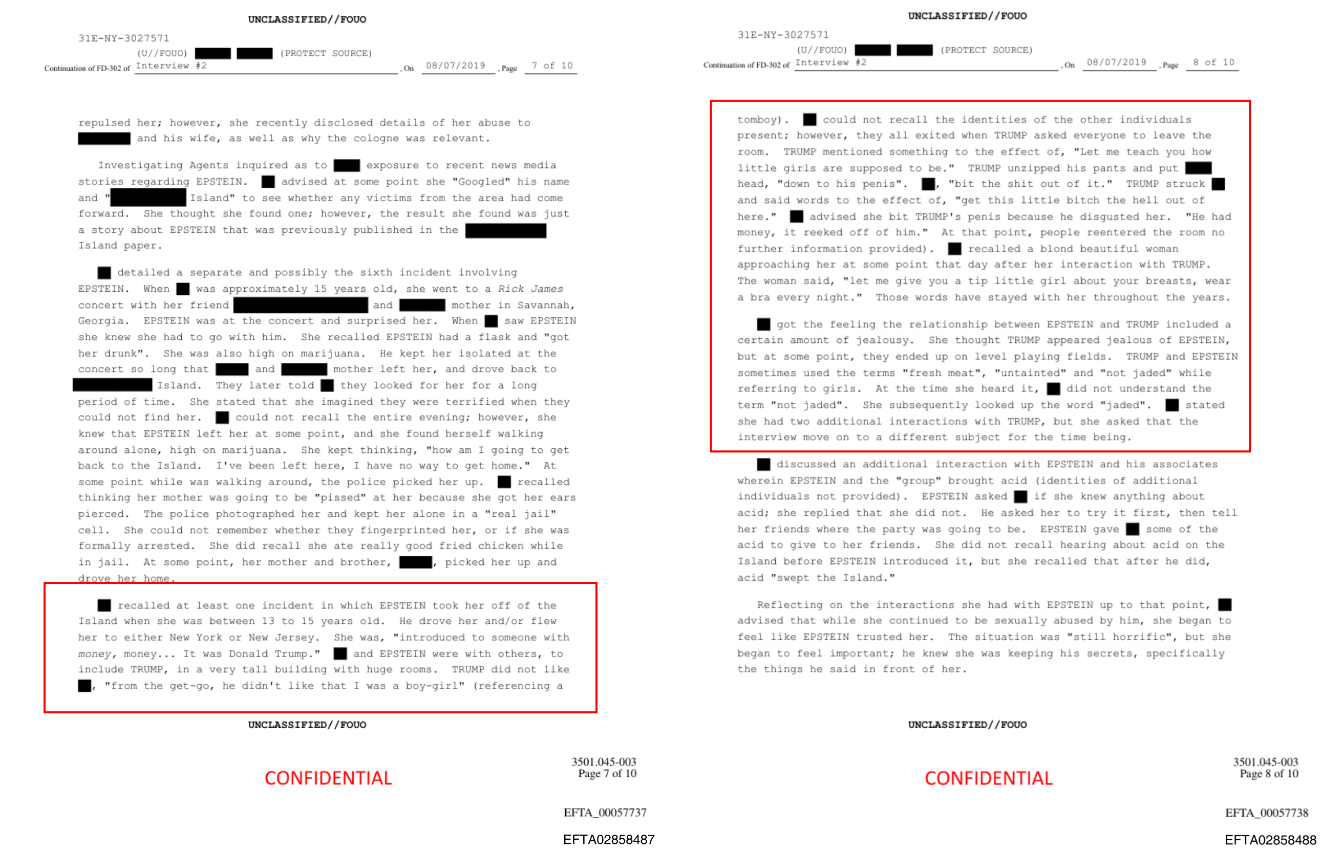 A 13 YEAR OLD GIRLBIT TRUMP'S PENIS>BIT TRUMP'S PENISBIT TRUMP'S PENIS>BIT TRUMP'S PENIS>VICTIM recalled at least one incident in which EPSTEIN took her off of the Island when she was between 13 to 15 years old. He drove her and/or flew her to either New York or New Jersey. She was, "introduced to someone with money, money... It was Donald Trump.">VICTIM and EPSTEIN were with others, to include TRUMP, in a very tall building with huge rooms. TRUMP did not like VICTIM, "from the get-go, he didn't like that I was a boy-girl" (referencing a tomboy). VICTIM could not recall the identities of the other individuals present; however, they all exited when TRUMP asked everyone to leave the room.>TRUMP mentioned something to the effect of, "Let me teach you how little girls are supposed to be." TRUMP unzipped his pants and put head, "down to his penis". VICTIM, "bit the shit out of it.">TRUMP struck VICTIM and said words to the effect of, "get this little bitch the hell out of here." VICTIM advised she bit TRUMP's penis because he disgusted her. "He had money, it reeked off of him.">At that point, people reentered the room. VICTIM recalled a blond beautiful woman approaching her at some point that day after her interaction with TRUMP. The woman said, "let me give you a tip little girl about your breasts, wear a bra every night." Those words have stayed with her throughout the years.