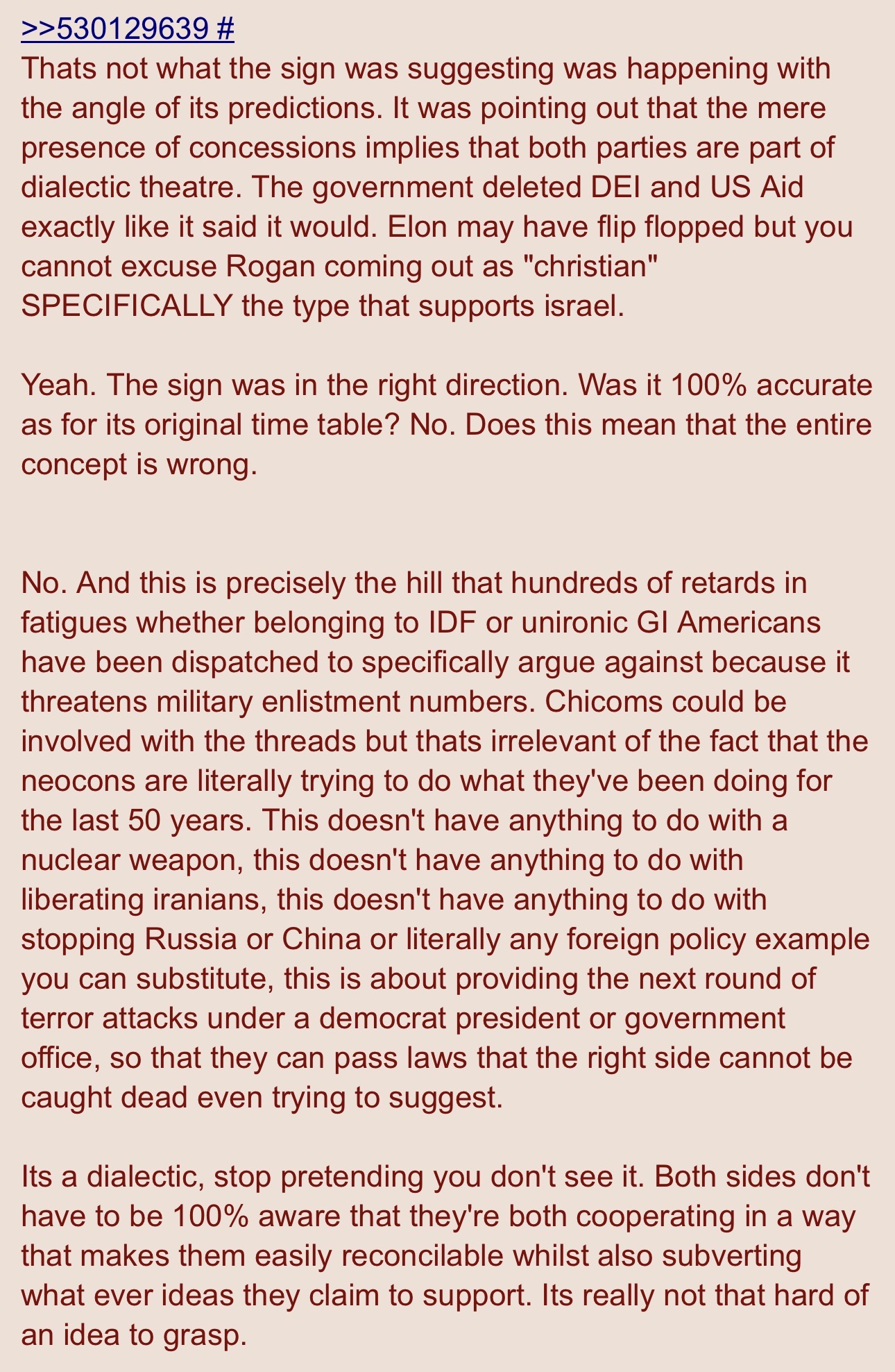 >>530127026>prediction about propaganda machine happened before the propaganda happenedIt says minor woke rollback. We got some talk on that from Trump and musk or whatever. Lip service. Then nothing material happened. That’s exactly what it says kek