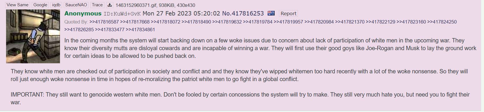 >>530127982>Promote misandrist and anti-white hiring practices for over a decade.>Commoditize housing on behalf of boomers and international parasites>Tell them everything their ancestors did was evil and wrong, even if they were simple farmers.>Turn nationalism into the greatest sin>Create a debt-based educational system>Do nothing of substance to rectify any of it>Call them loser NEETs>This will certainly ignite young mens' patriotic fighting spirit.Wish I could find the post where a former zogbot stated he would hunt and kill anyone trying to forcefully draft zoomers.I've met plenty of guys who served in the GWOT and can guarantee that sentiment isn't uncommon.