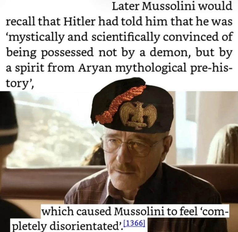 >>530125968Mussolini thought Hitler was weird>Nigga do you drink?>Nein, not really>Well maybe you fucken a should