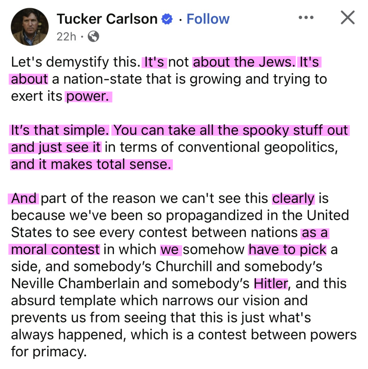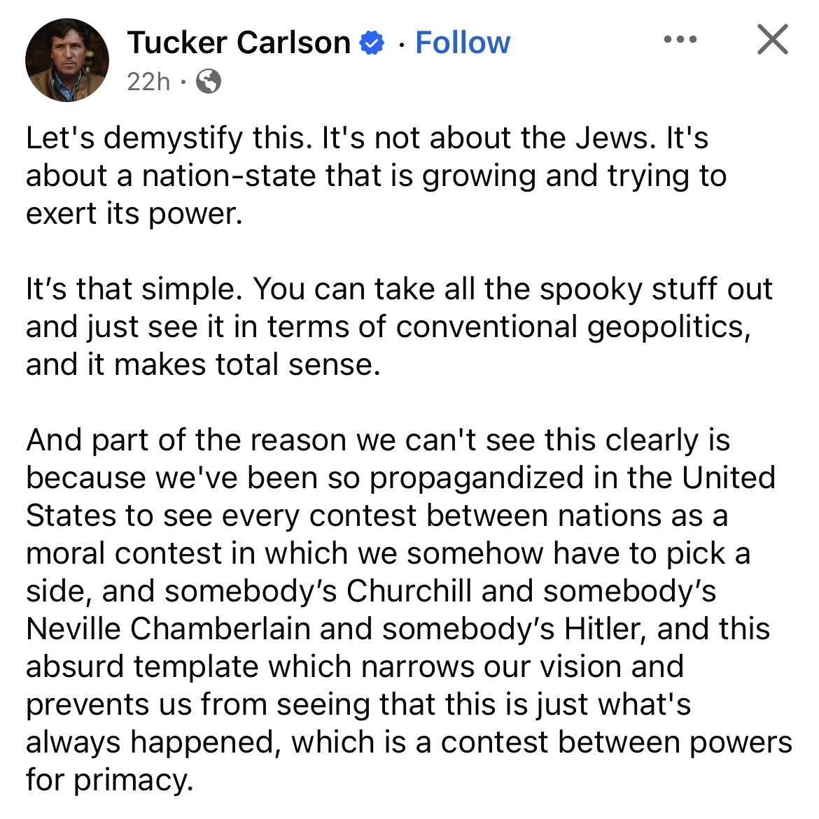 Tucker is that too but he's playing a character for ratings just like he did on Fox News. Right now his audience are simple minded third worldists and demoralized American woke rightists so he has to play up to them.