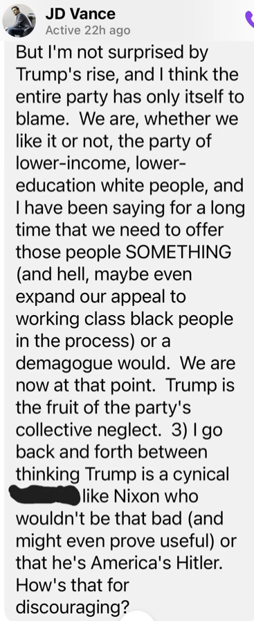 >>530148983He's already trying to disassociate from Trump on some key issues. He wants to keep the MAGA base on his side, but not be seen as partaking in some of Trump's worst actions.I don't think it's gonna work as Trump's stink will follow him to every debate and event.But on the other hand he has Thiel to shape the online landscape in Vance's favor. You already see pro-Vance shill threads here on /pol/ that are obviously bought and paid for.