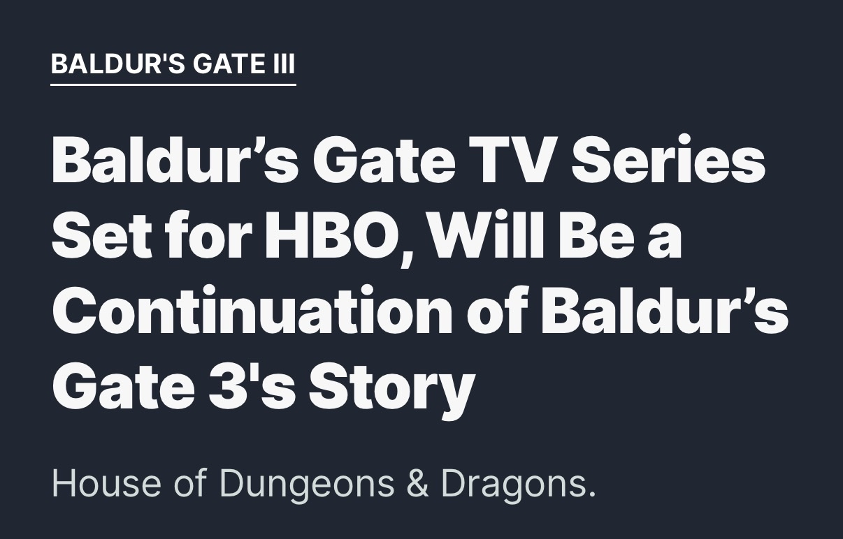 >Baldur’s Gate 3 is being adapted into an HBO TV series led by The Last of Us showrunner Craig Mazin. The series will serve as a direct sequel, following characters and dealing with the aftermath of the game's world-changing events. It is in early development, with potential for returning characters and a focus on the Forgotten Realms setting