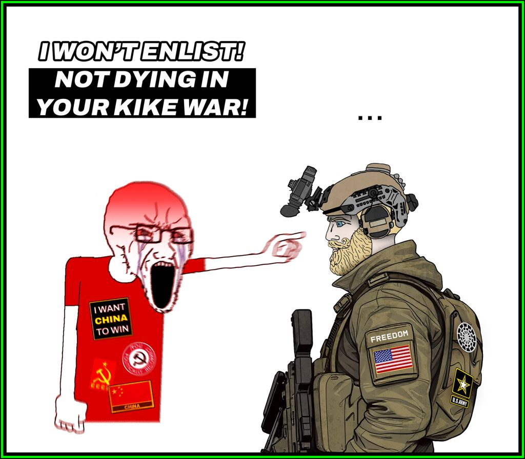 But you’re not fighting for your country, you’re fighting for The Donald and his pack of Zionists, banksters, and rabid Righter than Righteous Christcuck ignoramuses. The Jews are pawns in this drive to force the their globalist Jeezus to return! Did you vote for the Armageddonist Party? How absurd will it get when 75% of this country opposes this attempted plot to bring their right wing Jesus back? White feather fiods will demand you fight once again for an Eil that you believe is Good because some godsdamned greed-heads are looking for a “killing” — Don’t volunteer, make them take you!!