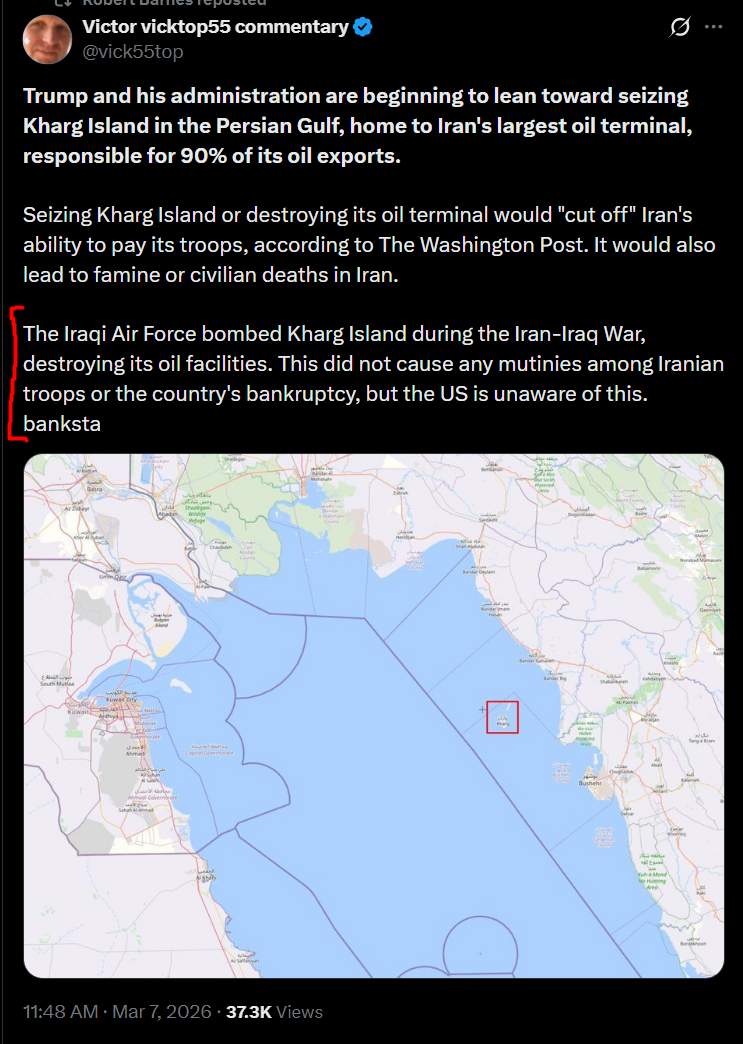 >>530153872Honestly Kharg isn't that important at this point, no ships are passing through hormuz anyway, also an pil terminal being taken won't cause a famine or any deaths really, you'd need to hit the domestic fuel and energy supply for that, which Israel and the US could do by hitting pipelines and pumping stations for rapid effect.