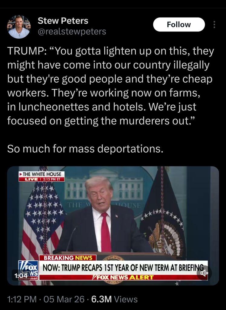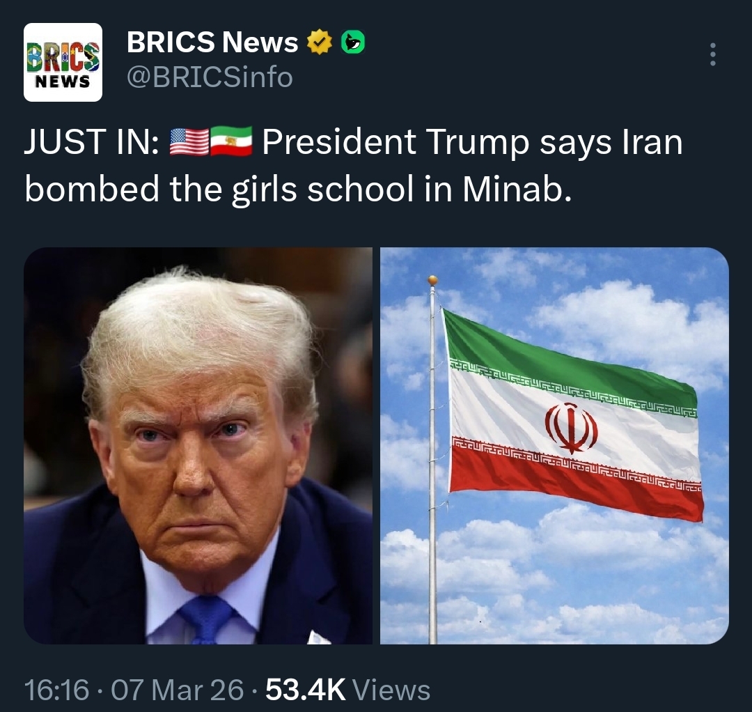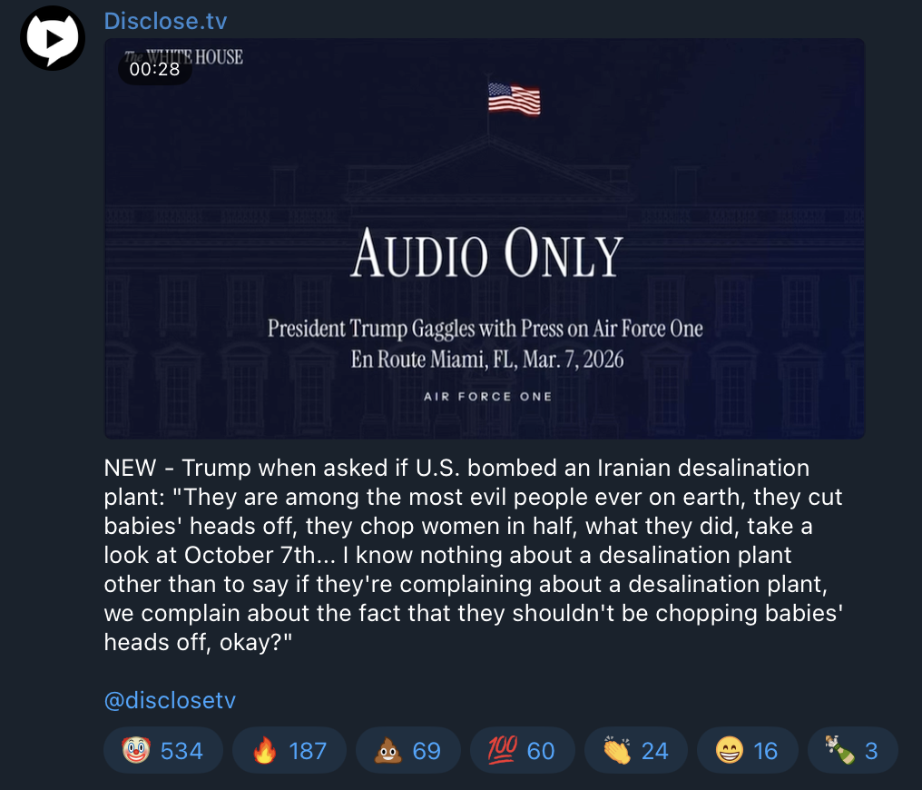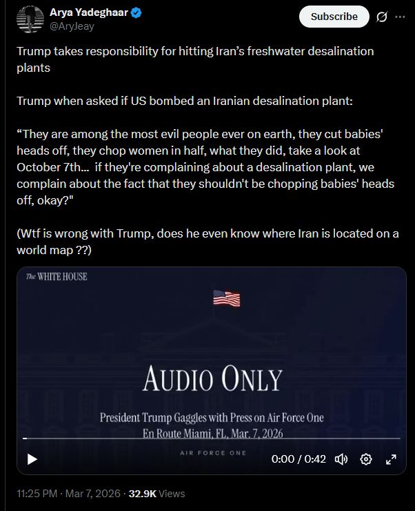Trump takes responsibility for hitting Iran’s freshwater desalination plantsTrump when asked if US bombed an Iranian desalination plant:“They are among the most evil people ever on earth, they cut babies' heads off, they chop women in half, what they did, take a look at October 7th... if they're complaining about a desalination plant, we complain about the fact that they shouldn't be chopping babies' heads off, okay?"(Wtf is wrong with Trump, does he even know where Iran is located on a world map ??)https://x.com/AryJeay/status/2030409449119375846