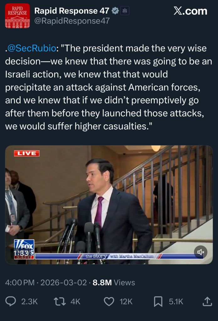 Fox News commenting on the unsustainability if the American war effort https://x.com/ShaykhSulaiman/status/2030320388522037333?s=20