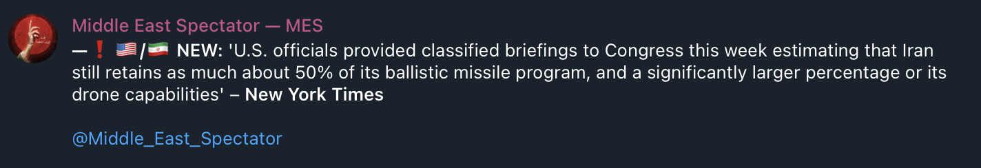 >NEW: 'U.S. officials provided classified briefings to Congress this week estimating that Iran still retains as much about 50% of its ballistic missile program, and a significantly larger percentage or its drone capabilities' – New York TimesYeah its more than that. Time to freak the fuck out