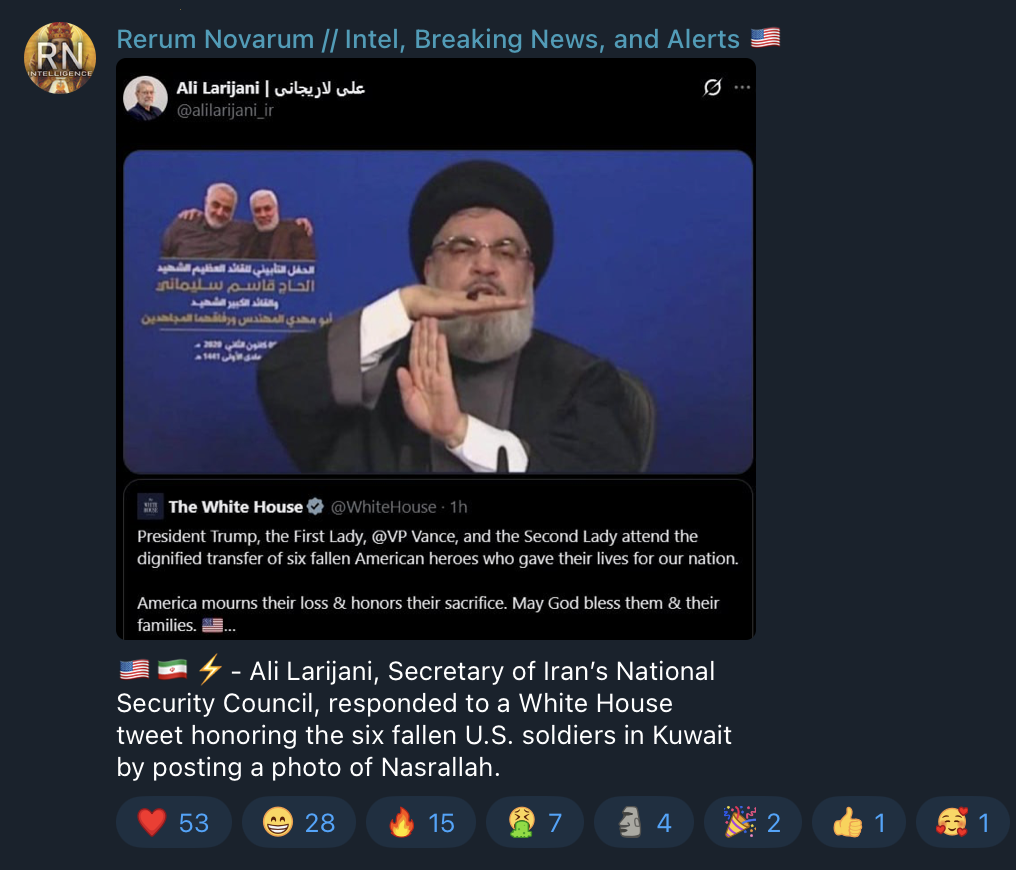 I think it's possible that Larijani is so cut off from the military that he's actually falling for x propaganda about American hostages.If we don't see video of American hostages within 24 hrs then it's confirmed