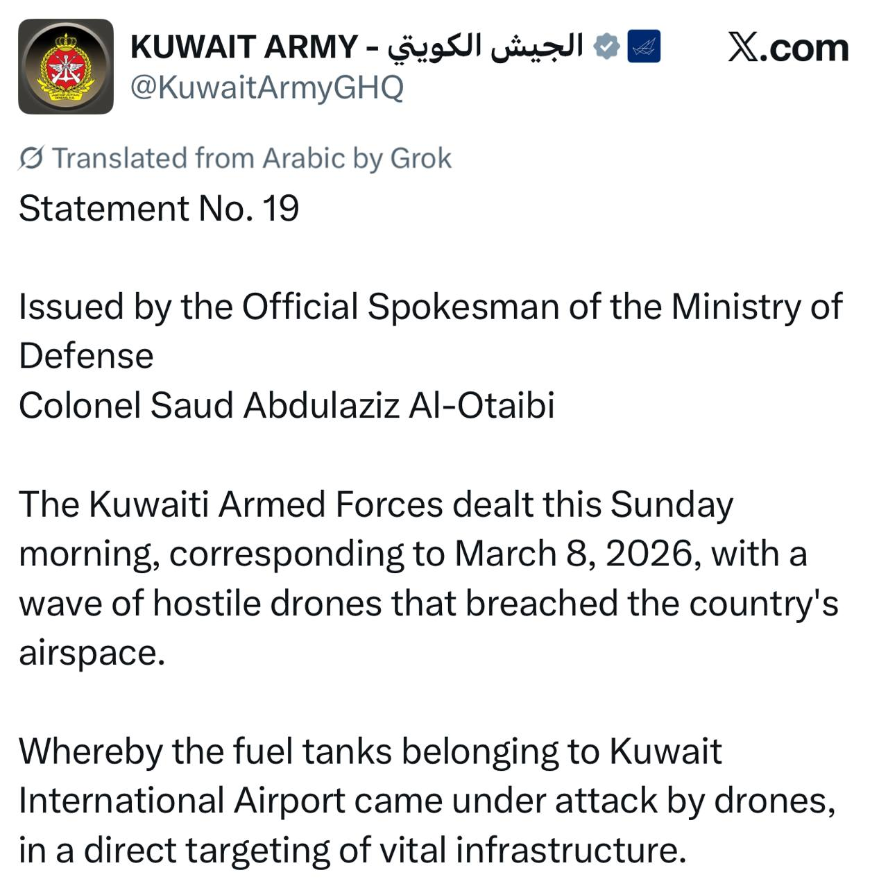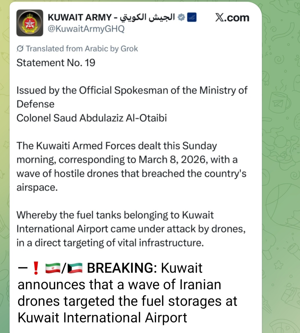 >BREAKING: Kuwait announces that Iranian drones targeted the fuel storages at Kuwait International Airport