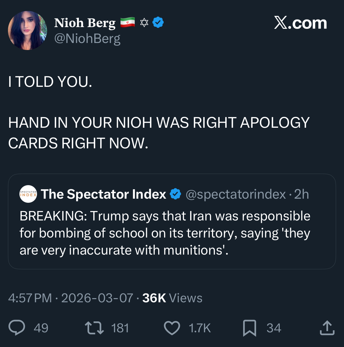 >>530158552>using other social mediaThere's your problem. However if Trump finishes this thing in 2 weeks and Iran capitulates it will be no fresh non-AI kino for us and just the orange retard and his Jew handlers being smug all over the news. So I want Iran to successfully resist, for my own entertainment. It will be much more fun to see Trump and Hegseth seething and zogbots being sent. First Gulf War was shit and boring, Second Gulf War was better, Third must be the most kino of all.
