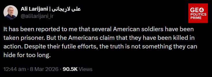 I don't think anyone ITT mentioned it, but Prof. Ali Larijani, Kantian philosopher and part-time de facto leader of Iran did an interview today. Highlights:>"We will punish Trump for assassinating the leader of the revolution. We will never let him go.">"The Americans talk of destroying our missiles and military capabilities. This is nothing but an expression of their delusions.">"Many US soldiers have been captured in the region. Trump is lying that only 6 US soldiers have been killed. He’ll probably later increase that number, saying they died 'by accident'.">"We have no issue with Azerbaijan, but if any conspiracies or attacks against Iran originate from there, we will respond.">"We do not welcome the expansion of the war's scope, but if the Europeans intervene in it, we will deal with them in kind.">"We did not 'close' the Strait of Hormuz, it was simply disabled due to the fears of the war.">"Even America cannot tell you what excuse it has to keep attacking Iran."