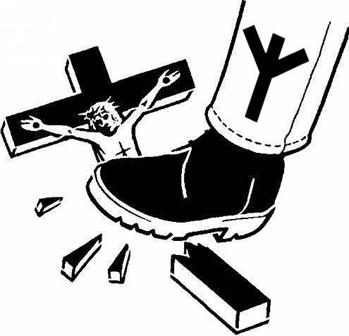 >>530170159>guy wearing casual gentlemen's shoe and slacks with a fictional rune with a made up meaning lightly steps on a crucifix
