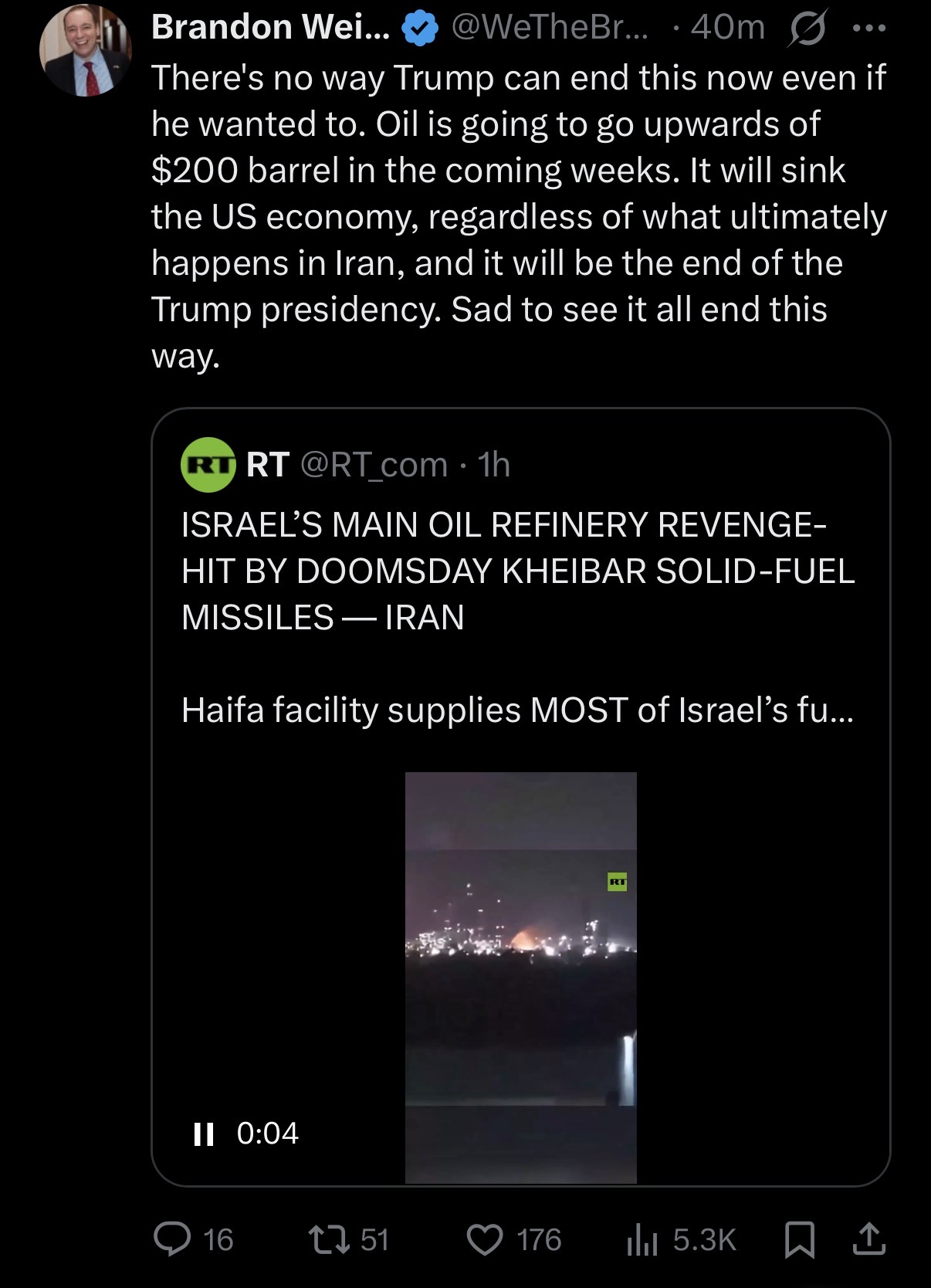 There's no way Trump can end this now even if he wanted to. Oil is going to go upwards of $200 barrel in the coming weeks. It will sink the US economy, regardless of what ultimately happens in Iran, and it will be the end of the Trump presidency. Sad to see it all end this way.