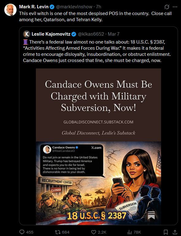 There’s a federal law almost no one talks about: 18 U.S.C. § 2387, “Activities Affecting Armed Forces During War.” It makes it a federal crime to encourage disloyalty, insubordination, or obstruct enlistment. Candace Owens just crossed that line, she must be charged, now.https://x.com/marklevinshow/status/2030420251922300933