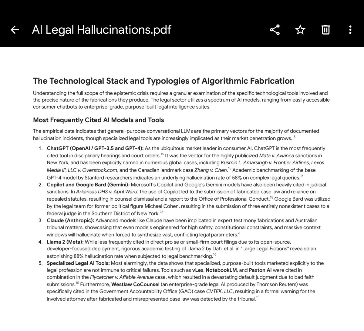 >>530190530I'm about to ask my paid Google Deep Research Agent the following questions:---Conduct a deep, comprehensive research report on the global phenomenon of 'AI legal hallucinations' in court filings from 2023 to the present.Please structure your research to answer the following:1. Global Statistics: Utilize sources like Damien Charlotin's 'AI Hallucination Cases database' or Stanford Law's CIS reports to provide quantifiable data. How many cases have been documented globally, and in which countries are they most prevalent?2. Demographics: What is the statistical breakdown of these incidents between licensed attorneys versus pro se (self-represented) litigants?3. The Tech Stack: Which specific AI models (e.g., GPT-3.5, GPT-4, Claude) and tools (e.g., ChatGPT, Copilot) are most frequently cited in these disciplinary hearings?4. Financial & Legal Fallout: Provide a summary of the most severe sanctions, fines, and wasted billable hours (e.g., opposition research costs) resulting from these fabrications.5. The Technological Divide: Contrast the failures of general-purpose LLMs against the success/mitigation rates of purpose-built legal AI tools utilizing Retrieval-Augmented Generation (RAG) tied to verified databases like Westlaw or LexisNexis.”---