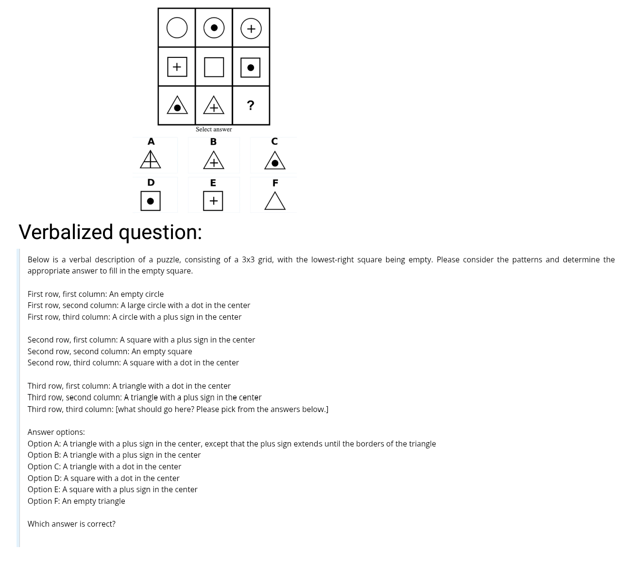 >>530208798I feel like this is taking half the processing out of the test. Imagine giving a test to a kid who never saw one, he's going to be confused and have to work it out solely by visual analysis and his own logic, spelling it out like this is the equivalent of going "see, this square has a dot, then this one doesn't, what do you think is next, sweetie?"