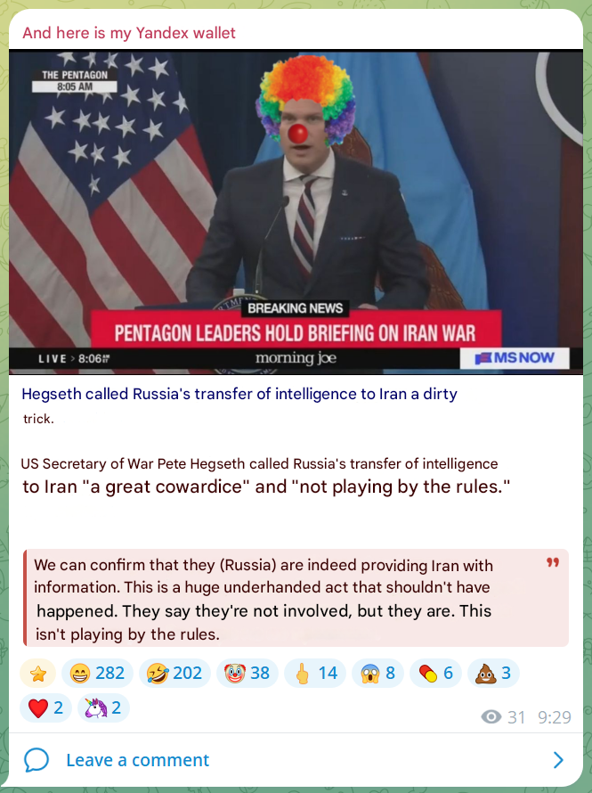 >>530192687>Indeed, let's try Telegram?"Russians are providing information to Iran"lmaofirst of all, what information?you think Iran doesn't have the locations of all US military bases in the region?you think those bases and buildings are all mobile?Iran has the coordinatessecond,.Iran has its own spy satellites: https://en.wikipedia.org/wiki/Iranian_Space_Agencythird, since 2025, Russia and Iran have some sort of active strategic agreement (but not alliance), so I'm sure Iran gets "some information and help"fourth, US not some arbiter in this Ukrainian conflictit covertly destroyed Nord Streams, which is an act of war by US and some allies against Russia in itselfUS is the main architect and sponsor of the proxy war, in which it is still actively participating by still providing Ukraine weapons and ammo, all the intel from hundreds of satellites and analysis and by providing military communications backbone (Starlink)in other words, Russia is not only morally allowed but should do way more than just "provide information to Iran"