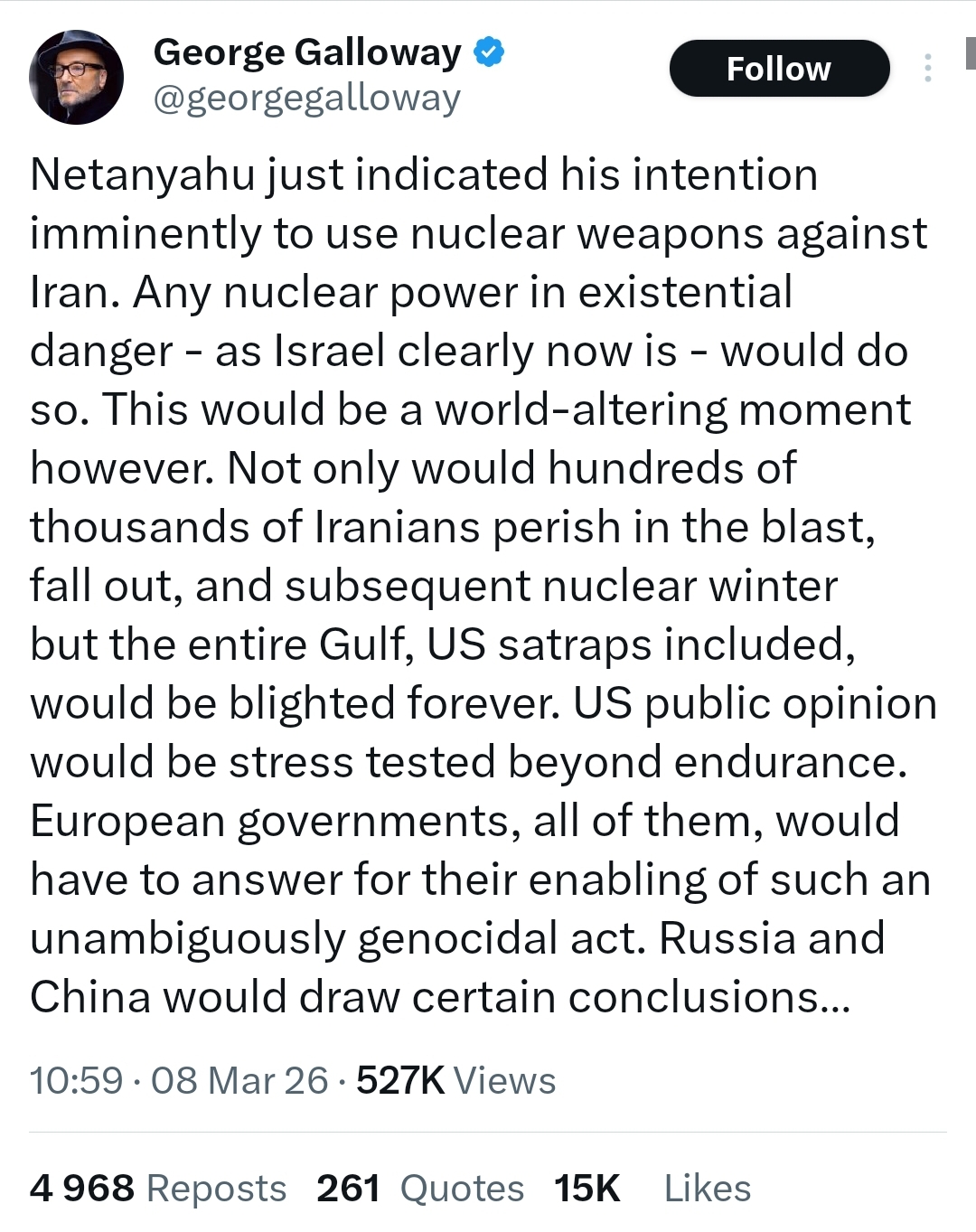 >>530200913In the long run Trump using a nuke on Iran would make the world safer.Literally every country in the world would drop everything and pursue nuclear weapons. It would be understood the US was a psycho Hitler tier murderer and the only way to be safe was to get nuclear weapons.It would be the last war ever waged.