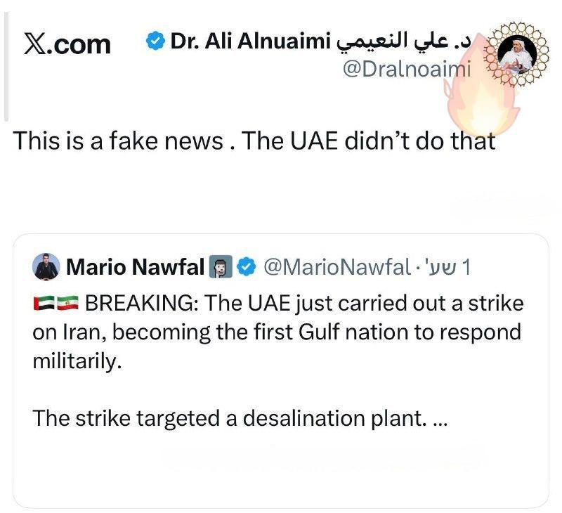 >Ali Al-Nuaimi, Chairman of the Defense, Interior, and Foreign Affairs Committee and member of the Federal National Council of the United Arab Emirates, denies claims that the Emirates attacked a water desalination facility in Iran: "Fake news"UAE STILL HYPER CÜCKED>UAE STILL HYPER CÜCKEDUAE STILL HYPER CÜCKED>UAE STILL HYPER CÜCKEDUAE STILL HYPER CÜCKED>UAE STILL HYPER CÜCKED