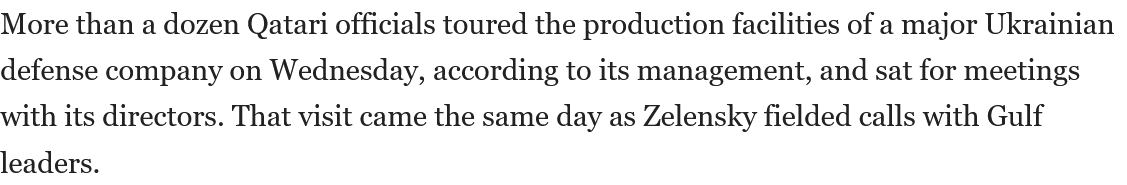 >>530212222It says the Qataris in particular flew out to meet Ukrainian defence companies on Wednesday so pretty rapido.