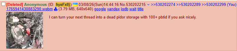 >>530213640Hey, Lance.Can you tell the banned hohol draft dodger that we desperately miss him back at our camp and that he should restart his router?
