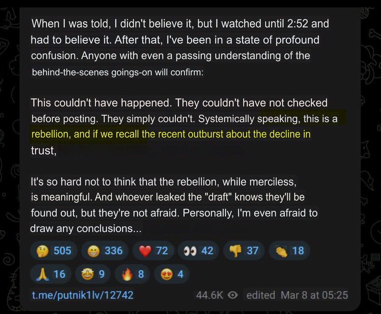 >Some Russian TG channels are simply shaking from the fact that a video with an unsuccessful greeting to women, in which Putin coughs, was posted on social networks. >Those who understand how Russian television works write that this cannot be a coincidence, because all videos with the dictator undergo thorough checks.He coughed?