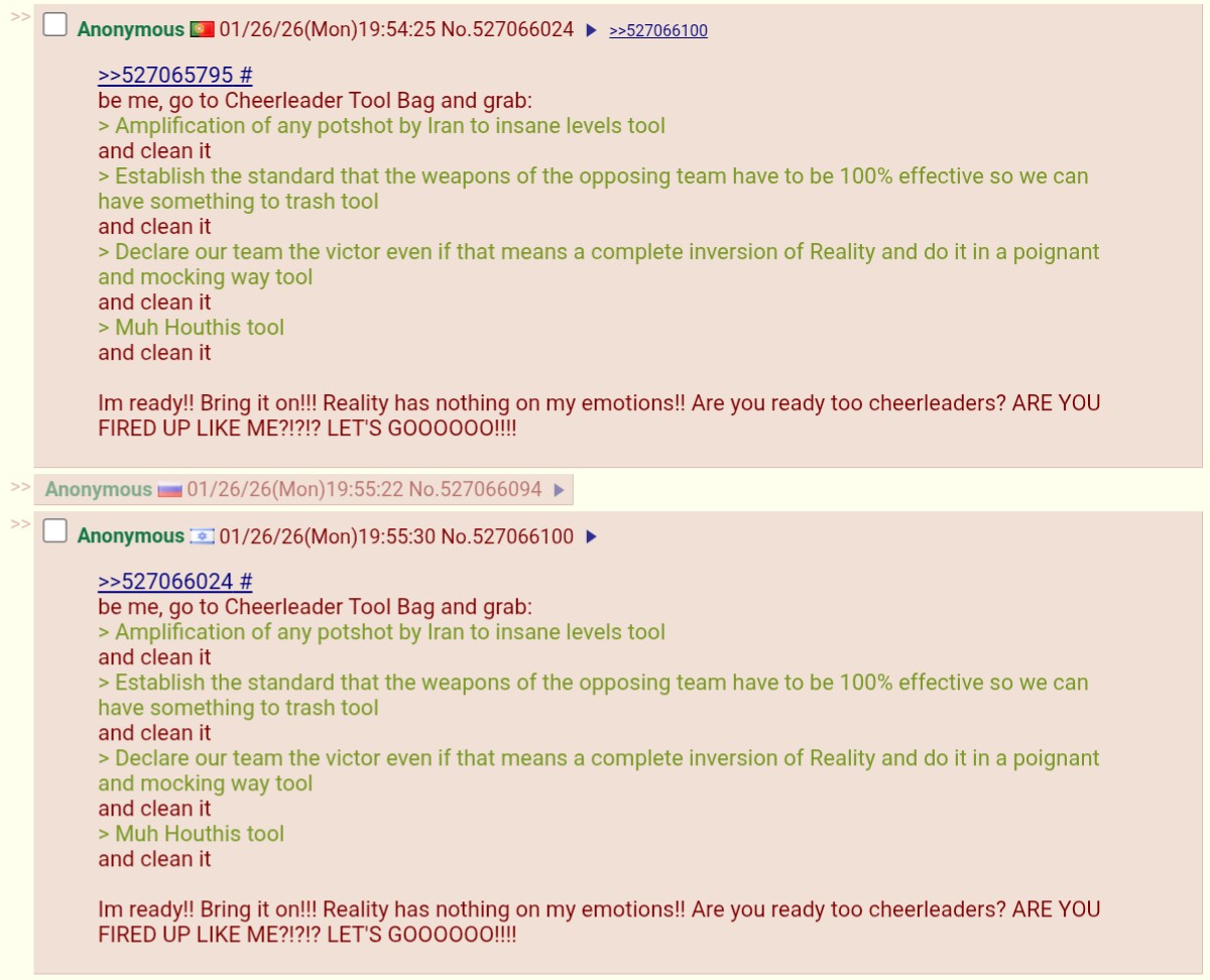 >>530219623not really, because this will be far more abstract, its nothing like 9/11 or pearl harbour.Both times you were the one that was "surprise attacked", now your are the aggressor and massively so, when you have your leading people go around 24/7 on social media claiming how they have won and will burn iran to the ground.Your main cause of fighting is "for the jews" unlike the last times were it was to "defend america".Your retarded leaders cornered the narrative so far, there is no chance of correcting that.