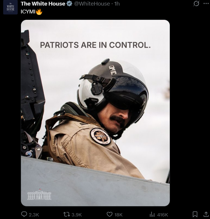 >>530218471Based Q postingPatriots are in control . Its nice to get dog whistles like this from the WH
