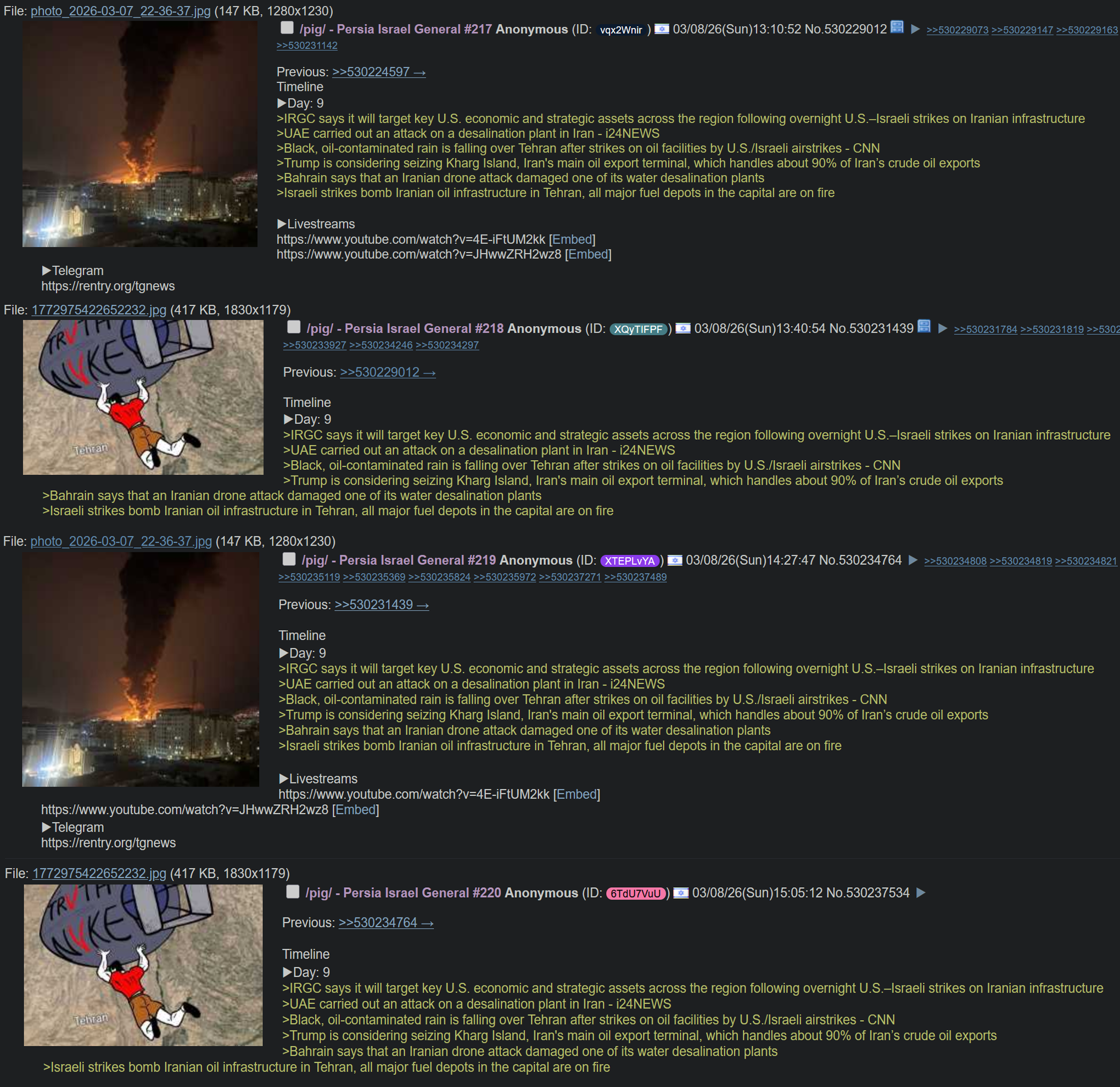 Previous: >>530234764Timeline▶Day: 9>IRGC says it will target key U.S. economic and strategic assets across the region following overnight U.S.–Israeli strikes on Iranian infrastructure>UAE carried out an attack on a desalination plant in Iran - i24NEWS>Black, oil-contaminated rain is falling over Tehran after strikes on oil facilities by U.S./Israeli airstrikes - CNN>Trump is considering seizing Kharg Island, Iran's main oil export terminal, which handles about 90% of Iran’s crude oil exports>Bahrain says that an Iranian drone attack damaged one of its water desalination plants>Israeli strikes bomb Iranian oil infrastructure in Tehran, all major fuel depots in the capital are on fire▶Livestreamshttps://www.youtube.com/watch?v=4E-iFtUM2kk https://www.youtube.com/watch?v=JHwwZRH2wz8 ▶Telegramhttps://rentry.org/tgnews▶Twitter accounts (using proxy frontend because twitter's UI is trash):https://nitter.net/clashreporthttps://nitter.net/FaytuksNetworkhttps://nitter.net/sentdefender▶Israel Rocket Alertshttps://www.tzevaadom.co.il/en/▶Air Traffichttps://www.flightradar24.com/https://flightaware.com/livehttps://globe.adsbexchange.com▶Maritime Traffichttps://www.marinetraffic.com/https://www.vesselfinder.com/Note: /pig/ is the only general for this event. Do not split it into dueling generals like /uhg/ and /chug/ or turn it into a support thread for either side.