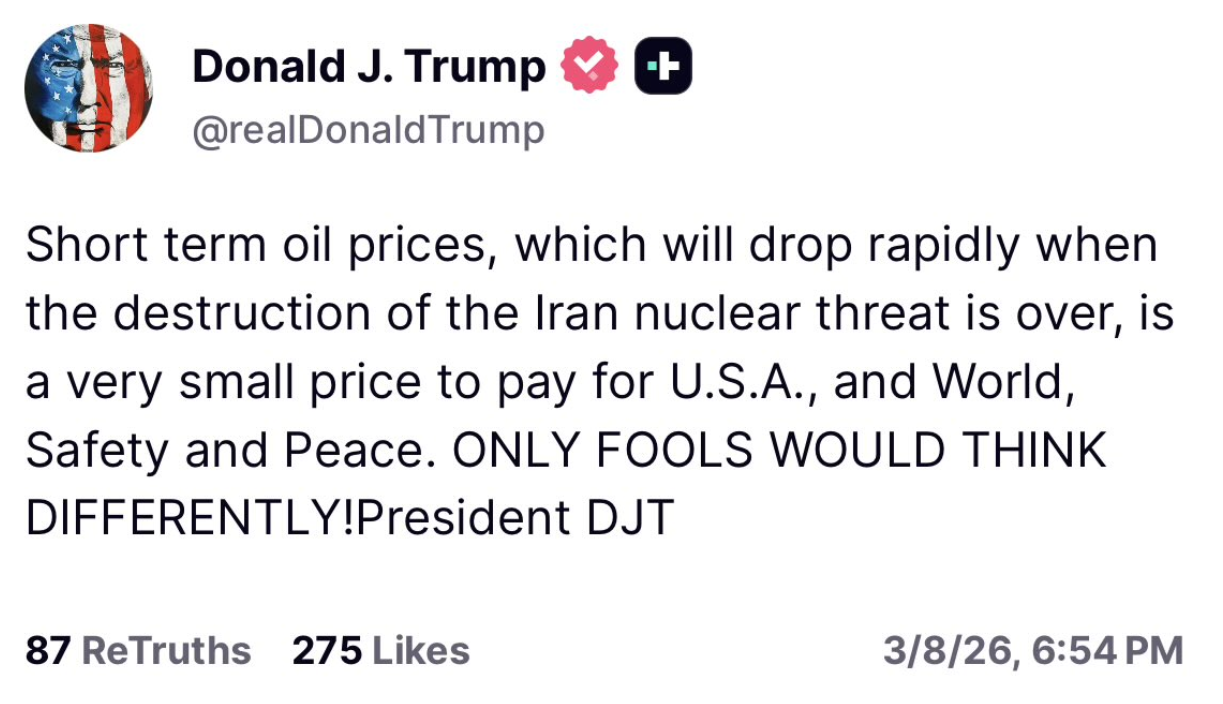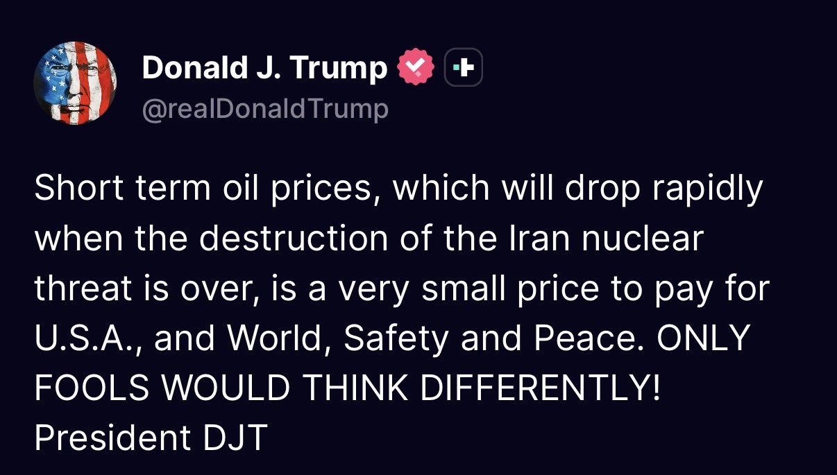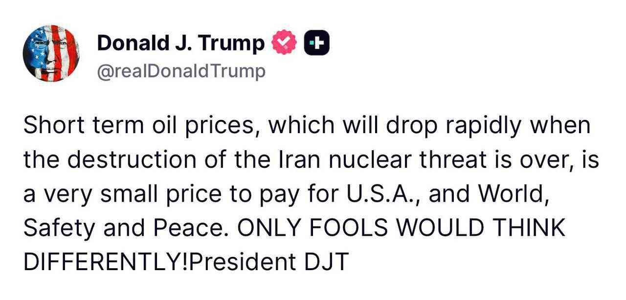 https://truthsocial.com/@realDonaldTrump/posts/116196014942465383>Short term oil prices, which will drop rapidly when the destruction of the Iran nuclear threat is over, is a very small price to pay for U.S.A., and World, Safety and Peace. ONLY FOOLS WOULD THINK DIFFERENTLY!President DJTIs this good chat?