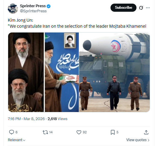 Kim Jong Un:"We congratulate Iran on the selection of the leader Mojtaba Khamenei March 8th, 2026 https://x.com/SprinterPress/status/2030784661090124152
