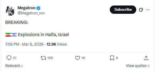 BREAKING: Explosions in Haifa, Israel March 8th, 2026 https://x.com/Megatron_ron/status/2030794743009923300