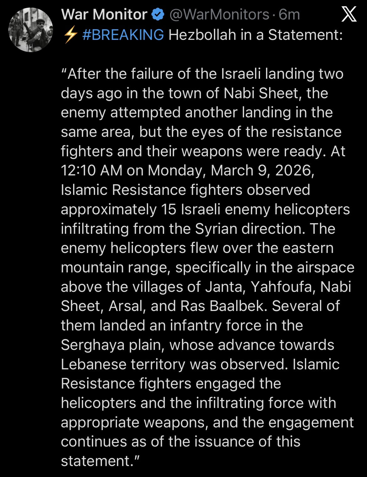 Hezbollah hits Chosenite helicopter https://x.com/ShaykhSulaiman/status/2030775824400478400?s=20