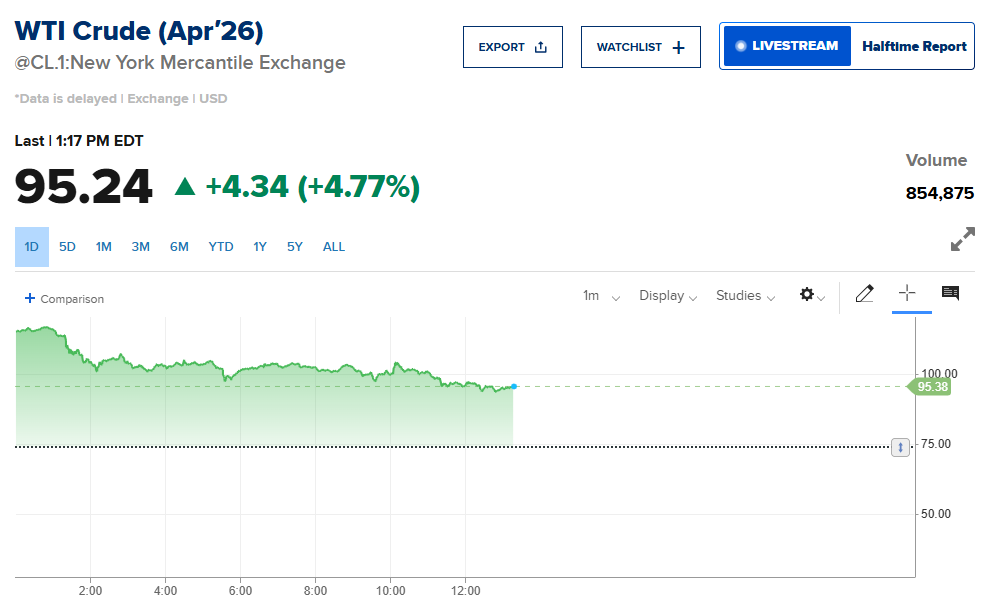 Closed at 93.31 on friday (daily high of 94.64). Opened at 99.75 on monday. Daily high of 119.50, daily low of 97.60