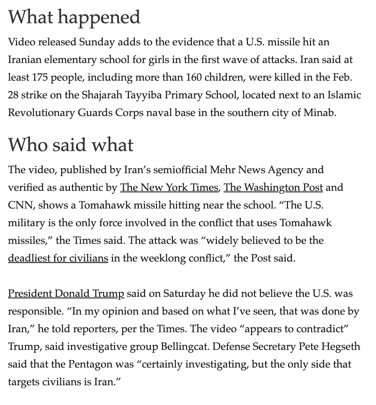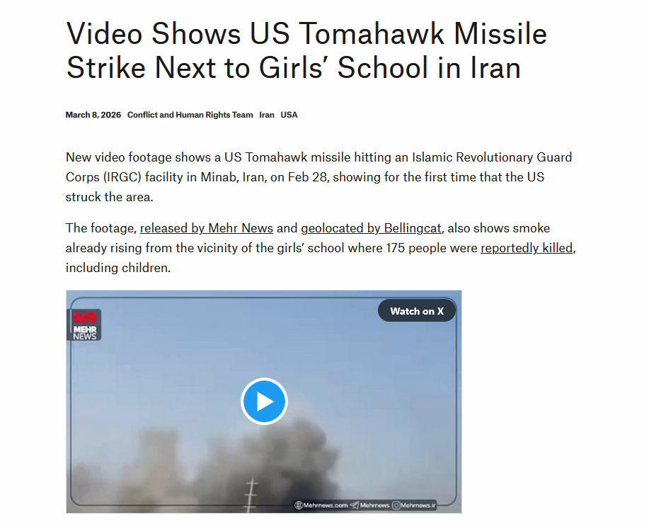 >>530300974Bellingcat disagreehttps://www.bellingcat.com/news/2026/03/08/video-shows-us-tomahawk-missile-strike-next-to-girls-school-in-iran/