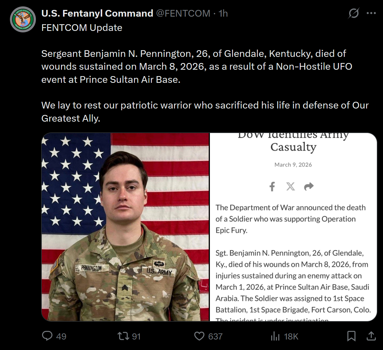 >>530300576>your son died valiantly in a non-hostile UFO event that is completely unrelated to the current war and therefore will not be counted as a casualty, here's your folded flag with President Trump's complimentsClownesque
