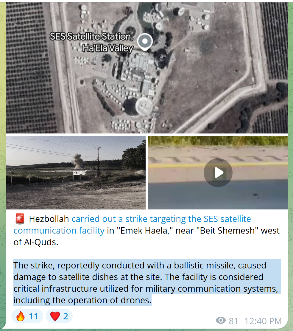 the Islamic Resistance fighters targeted, at 17:00 on Monday, 09/03/2026, the satellite communications station belonging to the Communications and Cyber Defense Division of the "israeli" enemy army in the Ella Valley in central occupied Palestine, which is located 160 km from the Lebanese border, with a salvo of qualitative missiles.