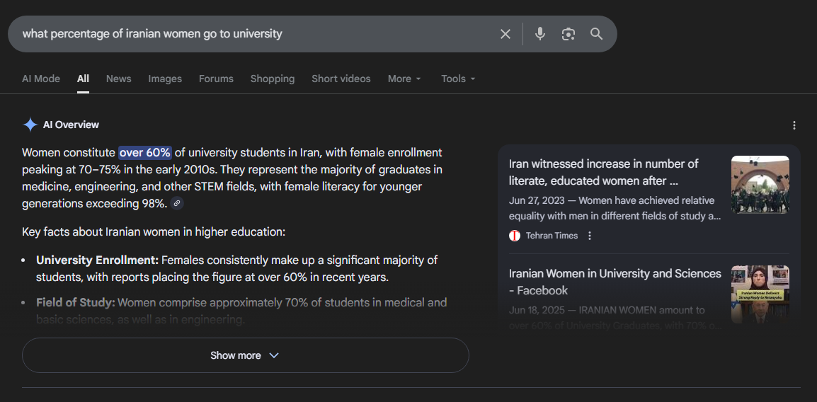 >>530305801Meanwhile in reality, most University students in Iran are female. The only oppression is a dress code, which they also have for men btw (they can't wear shorts and wife beaters)