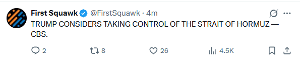 Trump: I am considering taking control of the Strait of Hormuz. They better not shoot anything new - otherwise, it will be the end of this country>Trump: I am considering taking control of the Strait of Hormuz. They better not shoot anything new - otherwise, it will be the end of this country