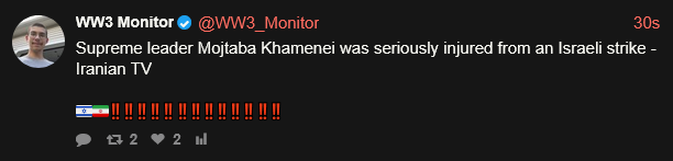 Previous: >>530313688Timeline▶Day: 10>France sends fleet of 8 warships to aid in reopening the Strait of Hormuz, including Aircraft Carrier: Charles de Gaulle>Oil prices dip back below $100/barrel>2nd Iranian ballistic missile targeting Turkey has been intercepted by NATO>Oil prices could reach $215 per barrel if the Strait of Hormuz disruption persists - WSJ>BAPCO oil refinery in Bahrain has been hit by an Iranian drone>Trump via TruthSocial: Short term oil prices, which will drop rapidly when the destruction of the Iran nuclear threat is over, is a very small price to pay for U.S.A., and World, Safety and Peace. ONLY FOOLS WOULD THINK DIFFERENTLY!>G7 countries considering release of emergency oil reserves - FT>Brent oil futures briefly reach $120, currently at ~105 pre-market>Khamenei's son Mojtaba has been declared the new supreme leader of Iran▶Livestreams[YouTube] LIVE: Middle East real-time cameras from Iran, Israel, Qatar and more[YouTube] Live from Tel Aviv: The capital is under missile fire.▶Telegramhttps://rentry.org/tgnews▶Twitter accounts (using proxy frontend because twitter's UI is trash):https://nitter.net/clashreporthttps://nitter.net/FaytuksNetworkhttps://nitter.net/sentdefender▶Israel Rocket Alertshttps://www.tzevaadom.co.il/en/▶Air Traffichttps://www.flightradar24.com/https://flightaware.com/livehttps://globe.adsbexchange.com▶Maritime Traffichttps://www.marinetraffic.com/https://www.vesselfinder.com/Note: /pig/ is the only general for this event. Do not split it into dueling generals like /uhg/ and /chug/ or turn it into a support thread for either side.