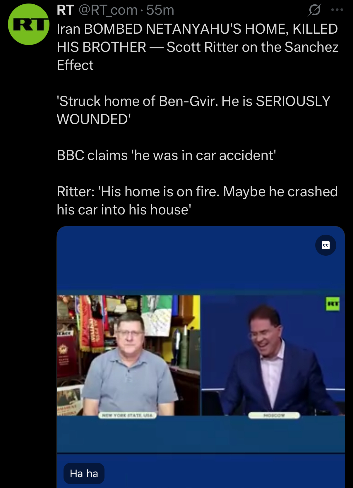RT Iran BOMBED NETANYAHU'S HOME, KILLEDHIS BROTHER— Scott Ritter on the Sanchez Effect'Struck home of Ben-Gvir. He is SERIOUSLY WOUNDED'BBC claims 'he was in car accident'Ritter: 'His home is on fire. Maybe he crashed his car into his house'