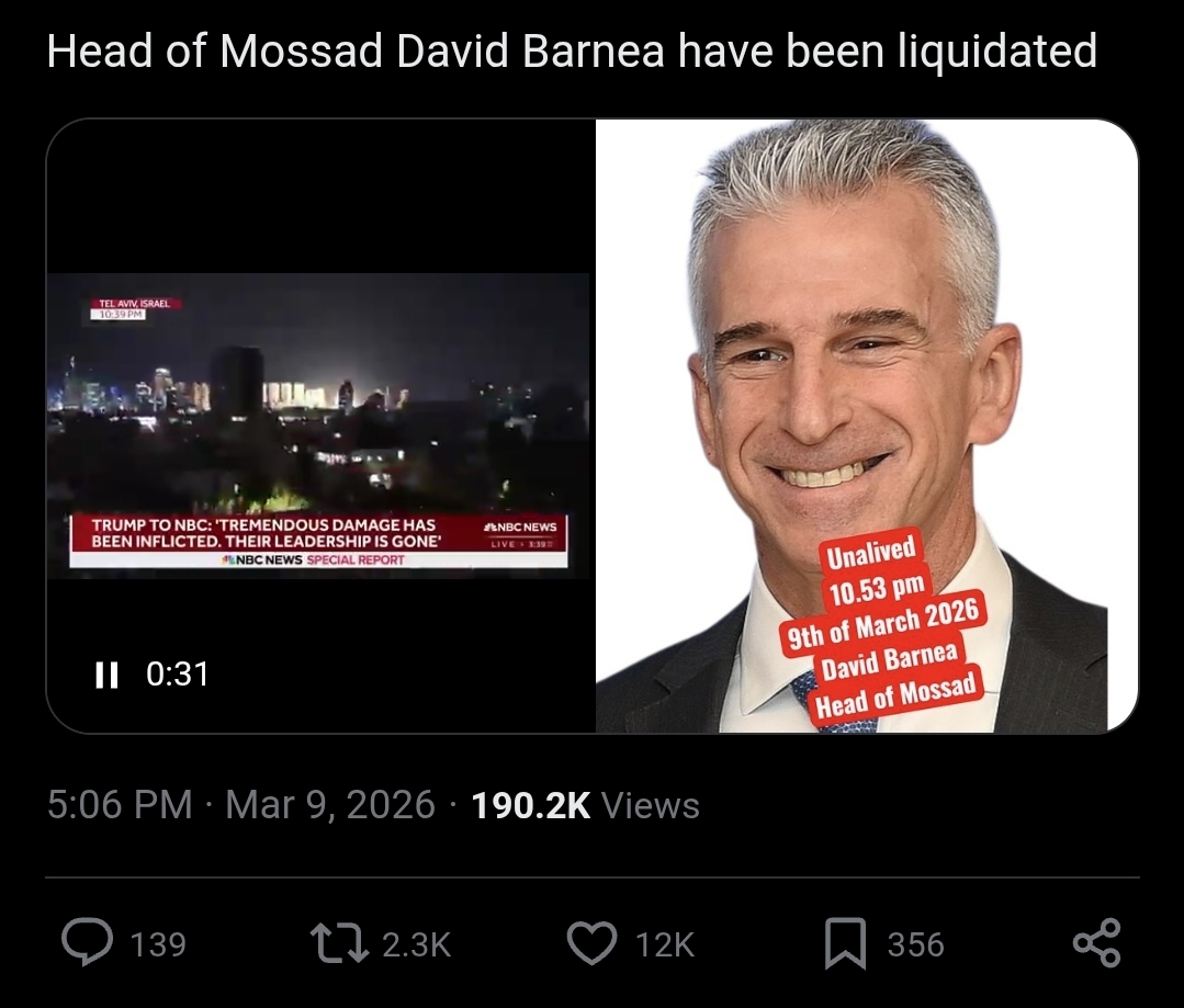 >>530338189Is the leader of Mossad really killed? I hope so. This is long overdue payback for the attack on the USS Liberty, JFK Assassination, 9/11, and who knows what all else.Its a shame my own government allowed our "ally" to murder Americans and get away with it all this time.
