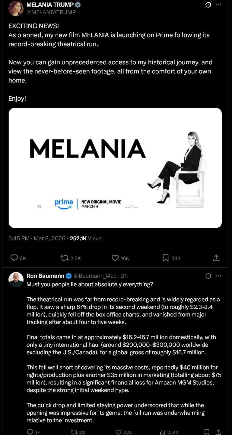 Holy tone deafness Batman!https://x.com/MELANIATRUMP/status/2030822263969210700