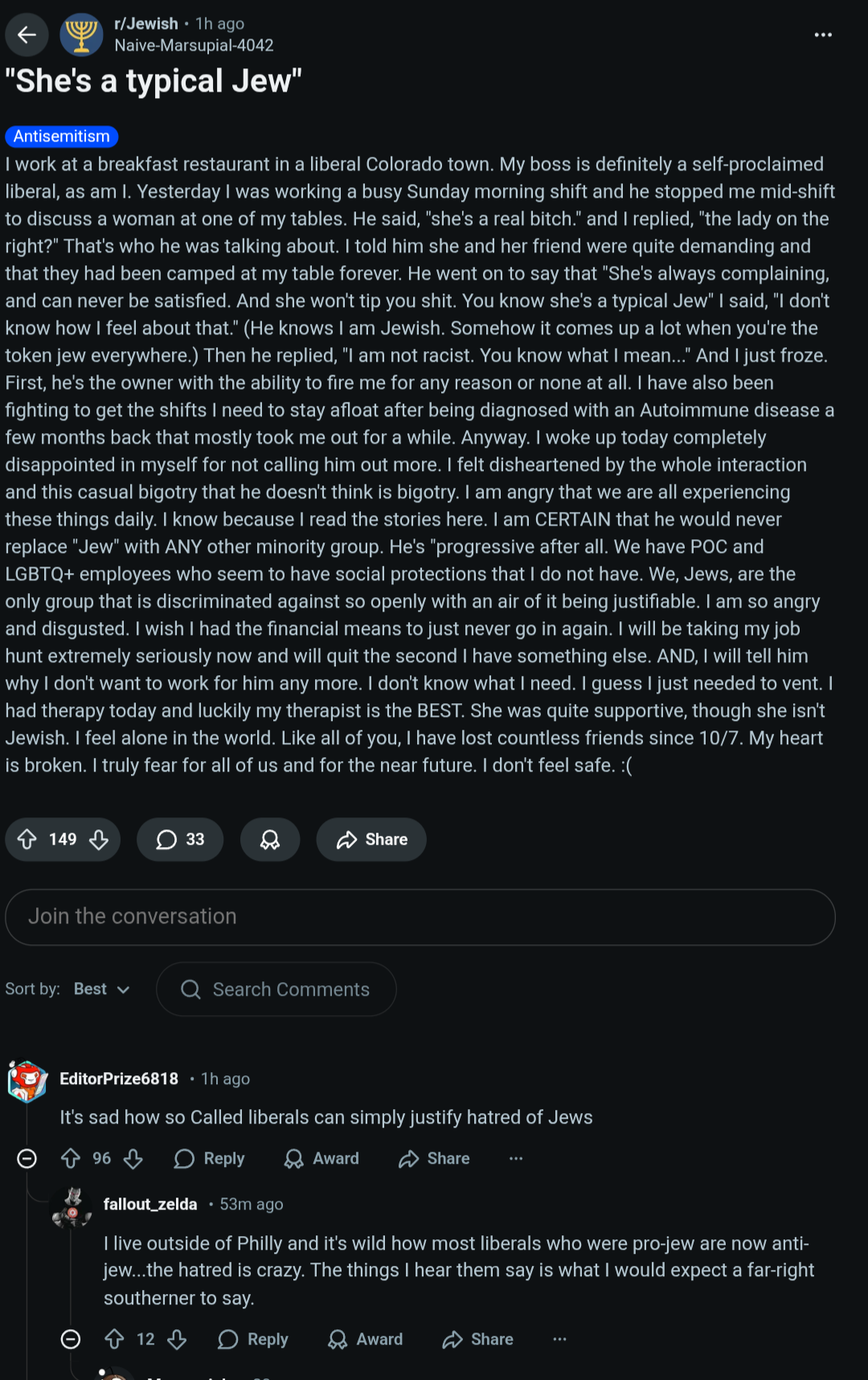 >>530343235as a fellow Jew I'm ashamed by this redditor's behavior for not realizing that open bigotry is a violation of the civil rights act, and he can sue his employer for that>pic related would have been me if I was in that position