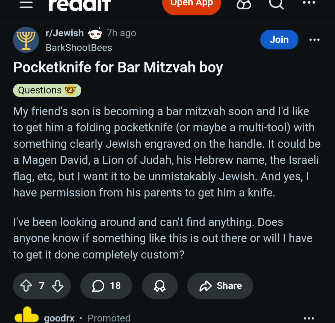 >>530343589He wants an "unmistakably jewish" knife. How freakish is that? Clearly it's for evil.