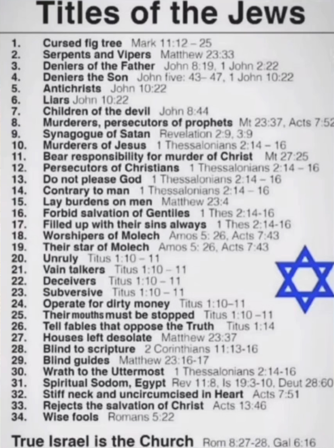 >>530351231Literally just read the bible>in Genesis 12, God is talking to Abram. Abram’s grandson Jacob (Israel) and great-grandson Judah don’t appear in the story for another 15 or so chapters>the covenant given to Israel the nation in the Torah is conditional (“do these things and you will be blessed, ignore them and get cursed in these specific ways”)>the prophets are basically all “please stop and turn back to God, shit will get fucked if you don’t” and “let me describe the coming messiah”>the history sections are all “here’s why you should have listened to the prophets”>the new testament is Jesus saying “you know that messiah guy? I’m him. you cannot know God except through me” and the jewish authorities spitting in his face and literally crucifying himHow does any of this put modern yids in a good light? Just because they co-opted the name “israel?”