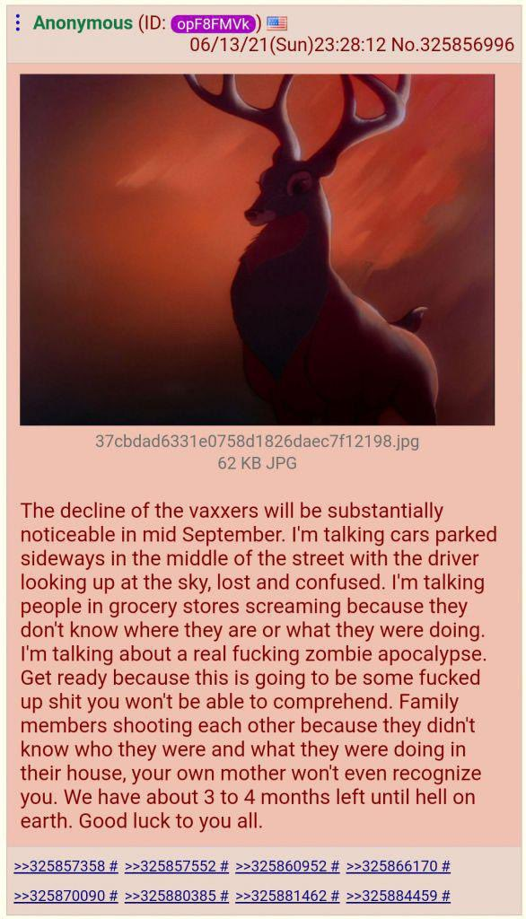 The failure of the red deer to materialize permanently buckbroke the antivax schizo's minds. These people were fully convinced that the vaccines would kill everyone in two weeks and all their problems would go away. They were even fantasizing about how their "pureblood seed" was going to be worth millions of dollars and women would suddenly have a reason to have sex with them (LOL!). As time went on and it became more obvious that nothing was going to happen, these people became increasingly unhinged, eating dangerous agricultural chemicals to treat a virus they didn't even believe existed, just because a scientist told them not to. Now that it's obvious the end result of the vaccines wasn't a mass die off and the consequent loss of their virginity, but rather an end to the pandemic and their becoming even more socially isolated than before, it has become impossible for them to reconcile what they need to believe with the undeniable reality, and so now, 5 whole years after the pandemic, they are still utterly mind broken and have not progressed mentally since 2020. They continue to go on about how it's only 10 more years, spike proteins this and prions that, scouring the internet for the latest news of an 87 year old dying to blame on the jab.Ironically, or perhaps appropriately, the antivaxxers are the only ones still experiencing the effects of the COVID pandemic. Everyone else has moved on.