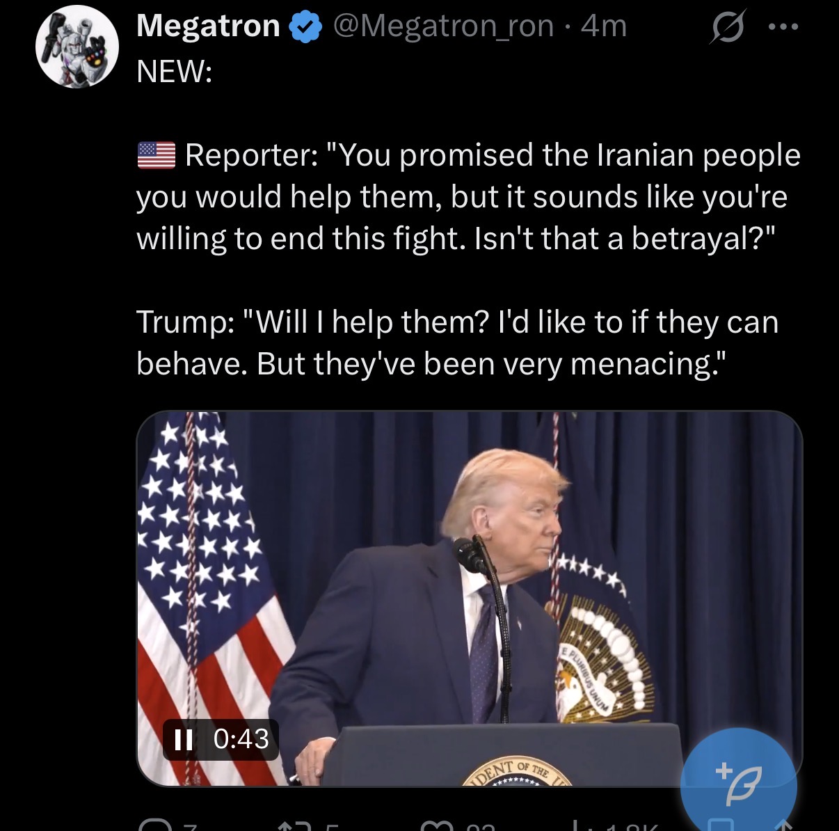 He no longer wants to help them and bring regime change. SCAMMEDhttps://x.com/Megatron_ron/status/2031190864371024326